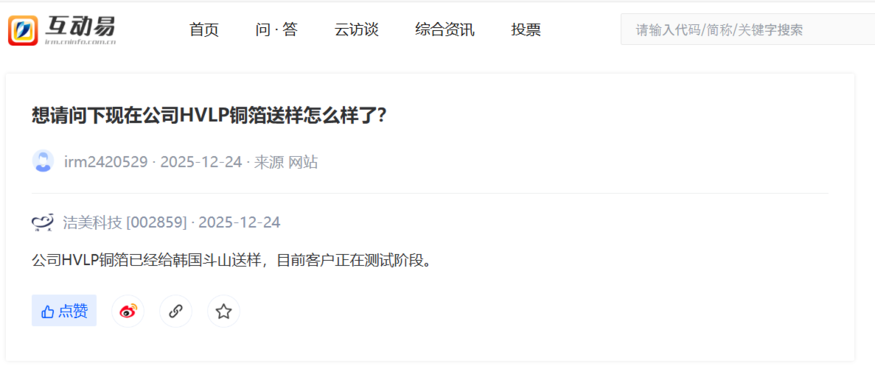 30일 업계에 따르면 지메이커지는 지난 24일(현지시간) 중국 선전증권소 투자자 소통 플랫폼(深交所互动易)에서 "HVLP 동박 샘플을 두산에 보내 테스트 단계에 있다"고 밝혔다.