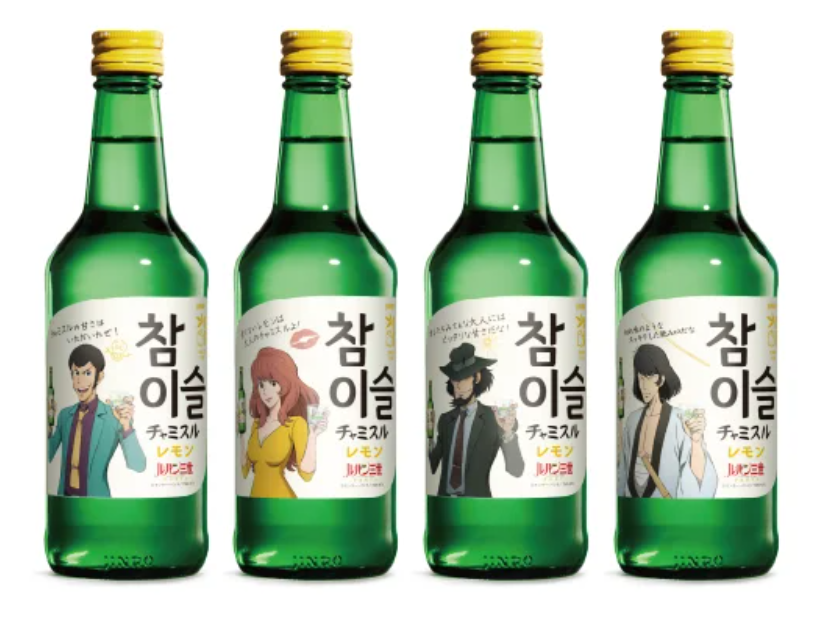 28일 하이트진로에 따르면 일본 법인은 최근 '루팡 3세×참이슬 레몬' 협업 라벨 제품을 수량 한정으로 출시했다. 루팡 3세를 비롯해 지겐 다이스케, 미네 후지코, 이시카와 고에몽 등 주요 캐릭터를 전면에 내세운 총 4종으로 구성됐다.