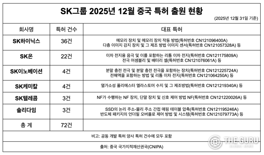 [더구루=정예린 기자] SK그룹이 작년 중국에서 1000건이 넘는 특허를 승인받으며 반도체와 배터리 등 주요 사업 분야와 관련한 특허 확보를 이어갔다. 승인 건수는 전년보다 소폭 줄었지만, 적층형 반도체 공정과 이차전지 소재·제조 기술 등 핵심 기술을 중심으로 특허가 승인된 점이 눈에 띈다.