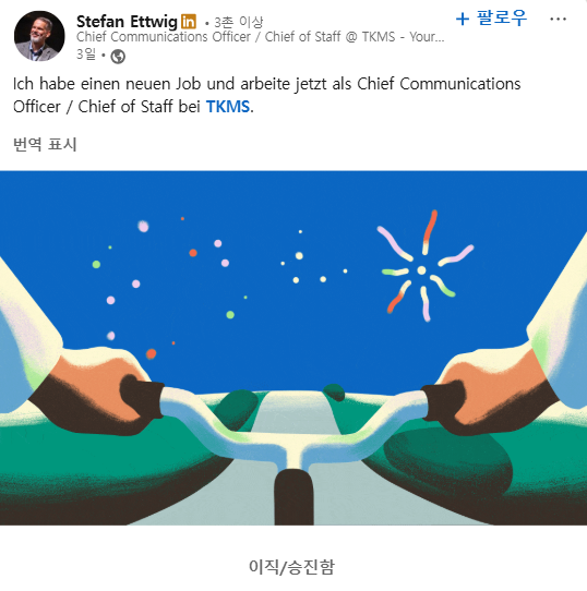 [더구루=오소영 기자] 독일 티센크루프마린시스템즈(TKMS)가 현지 일간지 WAZ와 티센AG(티센크루프 그룹 전신)에서 경력을 쌓은 커뮤니케이션 총괄 담당자를 선임했다. 노르웨이와 싱가포르 등 해외에서 수주가 확대되면서 대외 홍보 전략을 새롭게 짠다.