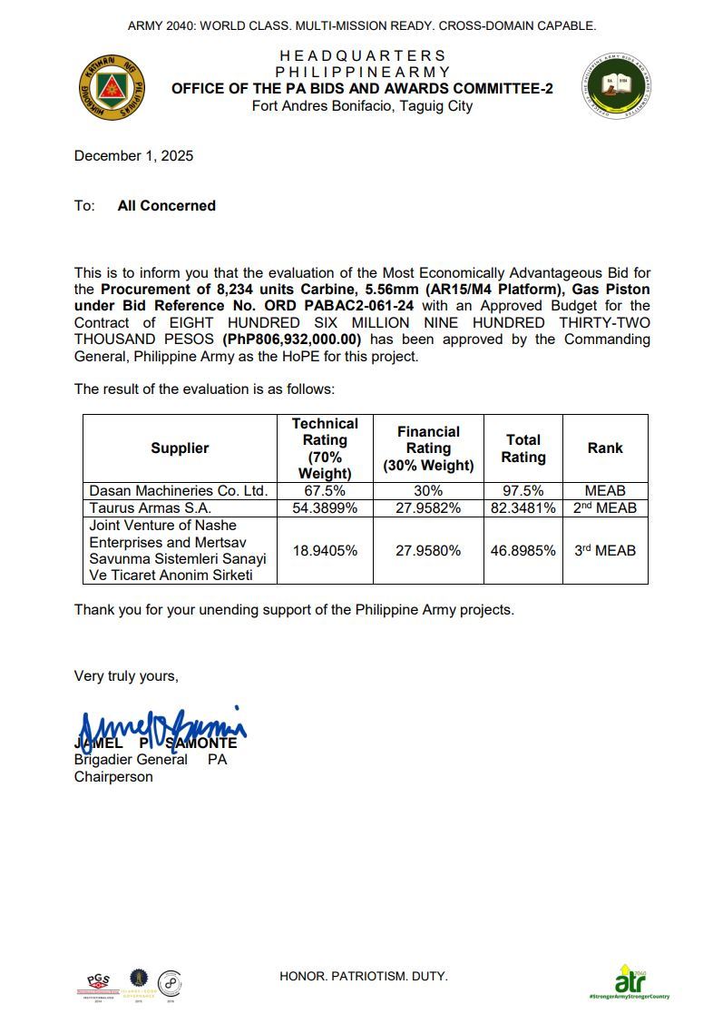 또한 필리핀 경찰과 공군이 DSAR-15계열 총기를 대규모로 운용하고 있다는 점도 긍정적인 평가를 받았다. 필리핀 육군은 이미 경찰과 공군 등이 대규모로 운용 경험을 축적한 만큼 향후 훈련, 유지보수, 부품 수급 등에서 효율적일 것이라고 판단했다. 제품 인도는 계약일로부터 300일 이내에 이뤄지기로 한만큼 올해 내 모든 물량이 공급될 예정이다.