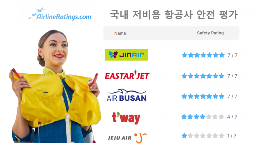 이 같은 기준에 따라 국내 LCC 가운데 제주항공은 안전등급 부문에서 별을 1개만 얻으며 가장 낮은 평가를 받았다. 반면 진에어·이스타항공·에어부산이 최고 등급인 7스타를 받았다. 티웨이항공은 4스타에 그쳤다.