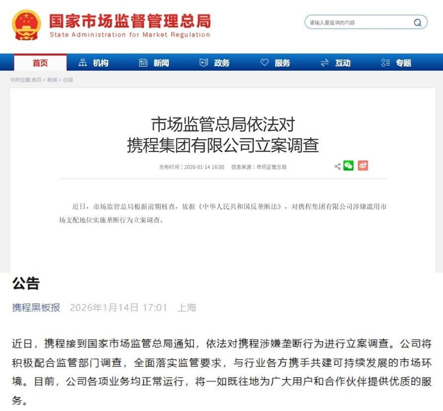 15일 중국 국가시장감독관리총국(SAMR)과 씨트립에 따르면 중국 당국은 최근 사전 조사 결과를 바탕으로 중화인민공화국 반독점법을 적용, 트립닷컴 그룹에 대한 시장 지배적 지위 남용 및 독점 행위에 대한 공식 입건 조사에 착수했다.
