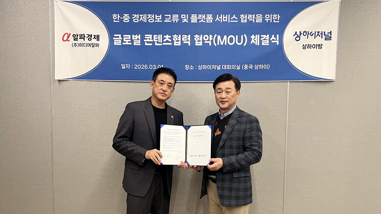 [더구루=오재우 기자] 알파경제는 중국 내 한인 미디어 상하이저널과 손잡고 한중 경제 정보 공유와 취재 네트워크 확대를 위한 전략적 파트너십을 체결했다고 4일 밝혔다.