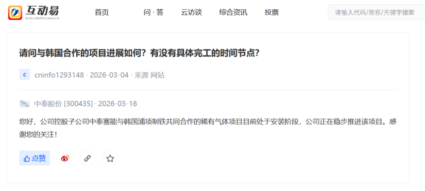 중국 선전증권소 투자자 소통 플랫폼(深交所互动易)에 따르면 중타이그룹(中泰股份)은 지난 16일(현지시간) 포스코와의 희귀가스 사업 현황에 대한 투자자 질문에 "현재 건설 단계에 있으며 순조롭게 진행되고 있다"고 밝혔다.