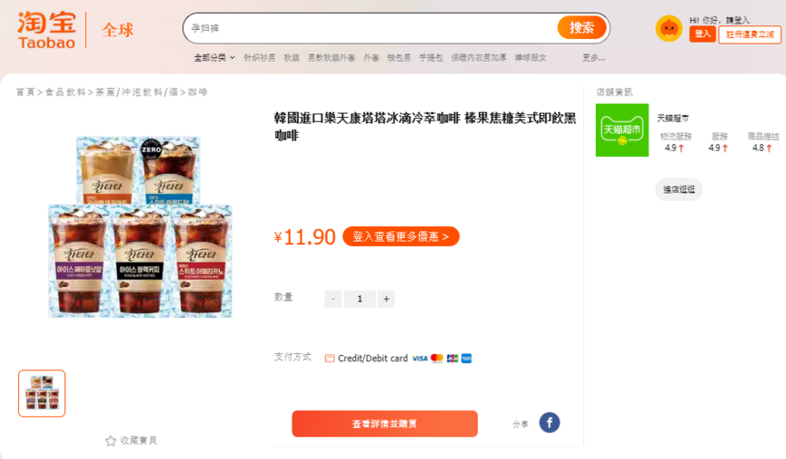 [더구루=진유진 기자] 롯데칠성음료 파우치형 RTD(Ready-to-Drink) 커피 '칸타타'가 알리바바 그룹 산하 중국 최대 전자상거래 플랫폼 '타오바오(Taobao)'에 입점, 눈길을 끌고 있다. 이번 입점이 '칸타타' 해외 판매 확대로 이어질 지 관심이 쏠린다.
