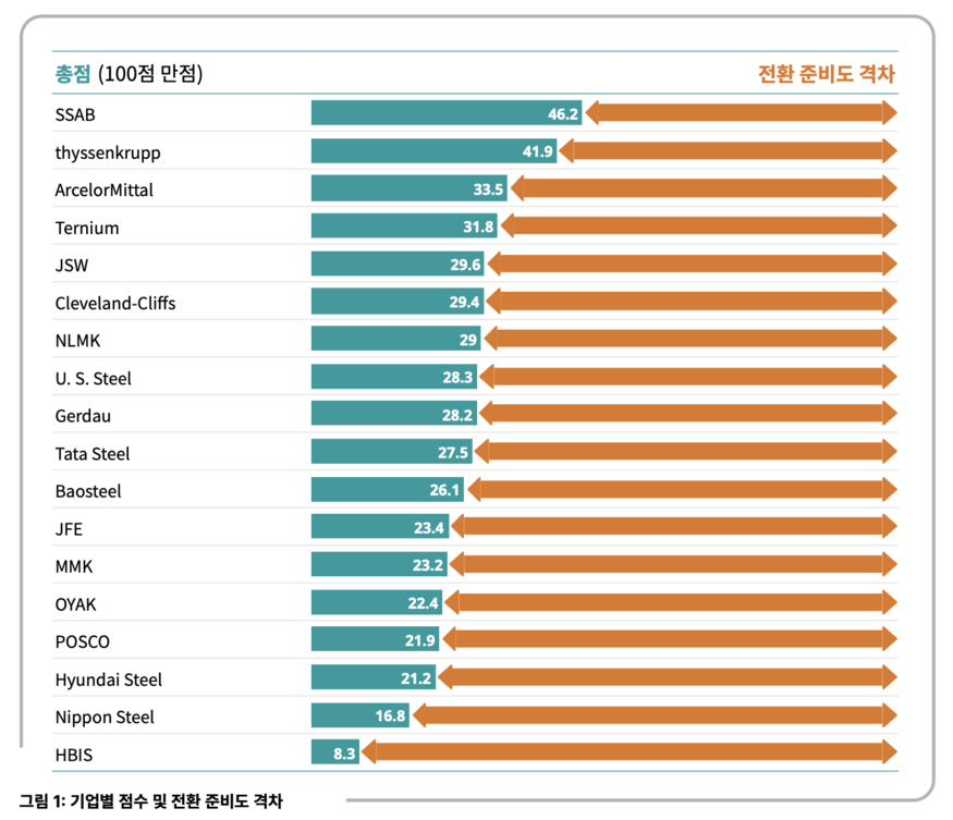 포스코와 현대제철은 일본제철(17위·16.8점), 중국 HBIS(18위·8.3점)과 함께 하위권 그룹에 포함됐다. 상위권에는 △1위 SSAB △2위 티센크루프 △3위 알세롤 미타르 △4위 테르늄 △5위 JSW스틸 등이 이름을 올렸다. 이들 기업은 고로 폐지 계획과 저탄소 생산 전환 전략을 구체화한 점에서 상대적으로 높은 점수를 받았다.