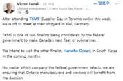 [더구루=오소영 기자] 캐나다 정부의 시선이 한화오션 거제조선소에 꽂혔다. 마크 카니 총리에 이어 빅터 페델리 온타리오주 경제개발부 장관도 한화오션 방문을 시사했다. 캐나다 차세대 잠수함 사업자 선정을 앞두고 주요 인사들의 발길이 이어지며 수주 전망에 힘이 실리고 있다. [유료기사코드] 페델리 장관은 최근 소셜미디어 '링크드인' 본인 계정을 통해 "최종 후보인 한화오션을 방문하기 위해 수개월 내에 한국을 찾을 예정이다"라고 밝혔다. 페델리 장관은 지난 2일 캐나다 토론토에서 열린 TKMS의 '공급자의 날' 행사에 참석했다. 캐나다에 제안한 212CD급 잠수함 모형을 살펴보고 TKMS 관계자들과도 회동했다. 이번주 오스트리아와 독일 순방의 일환으로 독일 킬에 위치한 TKMS 조선소를 둘러볼 계획이다. 이어 TKMS와 함께 후보에 오른 한화오션도 곧 방문하고 싶다는 의사를 전했다. 앞서 경주 아시아태평양경제협력체(APEC) 정상회의 참석차 방한한 마크 카니 총리도 거제조선소를 찾았다. 김동관 한화그룹 부회장과 동행해 시설 곳곳을 보고 장영실함(장보고-Ⅲ Batch-Ⅱ 1번함)에 직접 승함했다. 지난 9월에는 스테파니 벡 캐나다 국방차관이 거제조선소에서 어성철 한