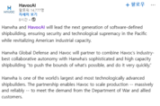 [더구루=오소영 기자] 한화가 미국 무인·자율운행 선박 개발 스타트업 '해벅AI(HAVOC AI)'와 손잡고 자율운항 기술을 함정에 접목한다. 무인 전투함의 새 시대를 열며 미국 방산 시장에서 수주 경쟁력을 강화한다. 29일 해벅AI에 따르면 한화와 자율주행 함정 사업을 위한 파트너십을 맺었다. 한화가 건조하는 함정에 해벅의 자율주행 기술을 결합해 미국 시장을 공략한다. 해벅AI는 소셜미디어 '링크드인'을 통해 "한화는 세계에서 가장 크고 기술적으로 앞선 조선소"라며 "이번 파트너십을 통해 해벅은 미 국방부와 동맹 고객의 수요를 충족하며 대규모로 안정적인 생산 확대가 가능해졌다"고 밝혔다. 이어 "이미 미군이 사용 중인 자율주행 시스템을 탑재함으로써 한화의 함정은 미군의 자율함대 전략을 강화하며 지속적인 임무 수행 능력을 제공할 수 있다"라고 덧붙였다. 2024년 설립된 해벅AI는 저렴하고 신속한 생산이 가능한 무인수상정(USV) 기술을 보유했다. 인공지능(AI)을 기반으로 수천 대 함정을 통합해 제어할 수 있는 소프트웨어도 개발했다. 미 국방부에 30여 척의 USV를 납품했으며 록히드 마틴을 비롯해 글로벌 방산 기업들과 파트너십을 맺고 있다. 현지 육군의