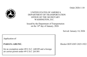 [더구루=김예지 기자] 국내 신생 저비용항공사(LCC) 파라타항공이 숙원 사업인 미국 노선 취항을 향한 9부 능선을 넘었다. 최근 미국 교통부(DOT)로부터 외국 항공사 운항 허가(FACP)에 대한 잠정 승인을 획득하며, 태평양 횡단 장거리 노선 진출을 위한 규제 장벽을 해소했다. 위닉스 인수 이후 제2의 창업을 선언한 파라타항공의 글로벌 네트워크 확대 전략이 탄력을 받을 전망이다. 20일 DOT 공식 승인 결정문에 따르면 DOT는 지난 14일 파라타항공에 대해 한국과 미국 간 여객 및 화물 정기 노선 운항과 관련한 법적 운항 권한을 즉시 확보할 수 있도록 면제권(Exemption)을 부여하는 명령(Order 2026-1-10)을 내렸다. 동시에 파라타항공에 외국 항공사 운항 허가를 부여하는 것이 공공의 이익에 부합한다는 예비 결정(Tentative Finding)도 함께 제시했다. 이에 따라 파라타항공은 정식 허가가 발효되기 전이라도 최대 2년간, 또는 정식 허가 발효 시점까지 유효한 운항 권한을 확보하게 됐다. 이번 결정은 최종 승인 전 이해관계자들의 의견을 듣는 '쇼 코즈(Show Cause, 이의 제기 요구)' 절차를 남겨둔 잠정 승인 단계로, 이해관